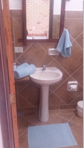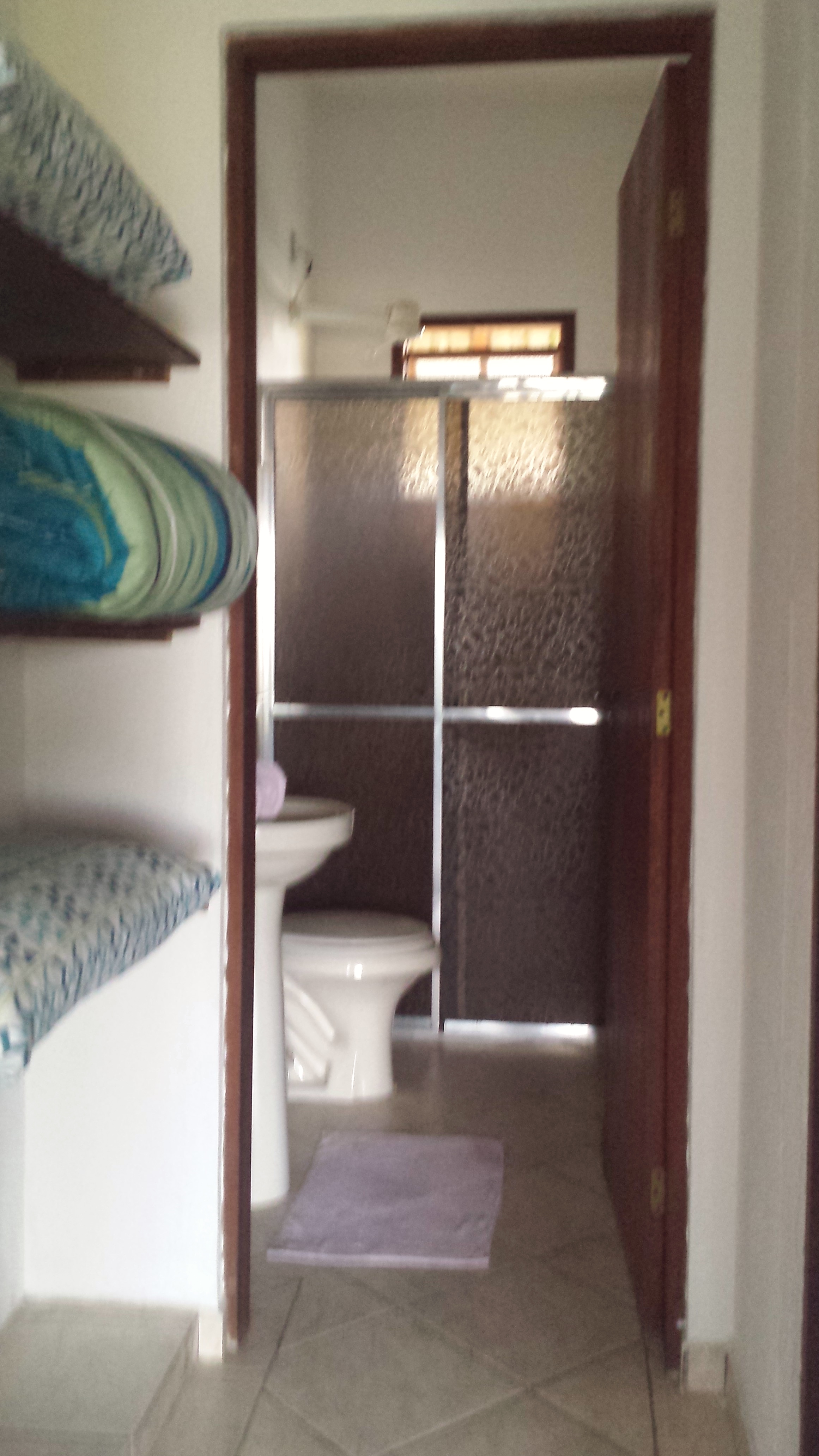 ventilador de teto, banheiro com box e ducha higiênica, mesa e banquetas...e churrasqueira.